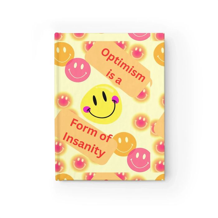 This spiral notebook brings a playful, slightly ironic energy to everyday notes. Bright smiley faces float across a soft yellow background while bold text reads “Optimism is a Form of Insanity,” giving the cover a tongue-in-cheek attitude that sparks curiosity. Inside, substantial 90gsm ruled pages make handwriting smooth and comfortable, while a sturdy metal spiral lets pages turn freely or be removed cleanly. The inside back pocket holds loose receipts, ideas, and clippings so your thoughts stay organized. At 6 x 8 inches it’s compact enough for a tote or desk, but roomy enough for journal entries, lists, and sketches. Use it when you need a reminder to laugh at the absurd, plan something messy and ambitious, or sketch out the sort of half-crazy ideas that become projects.